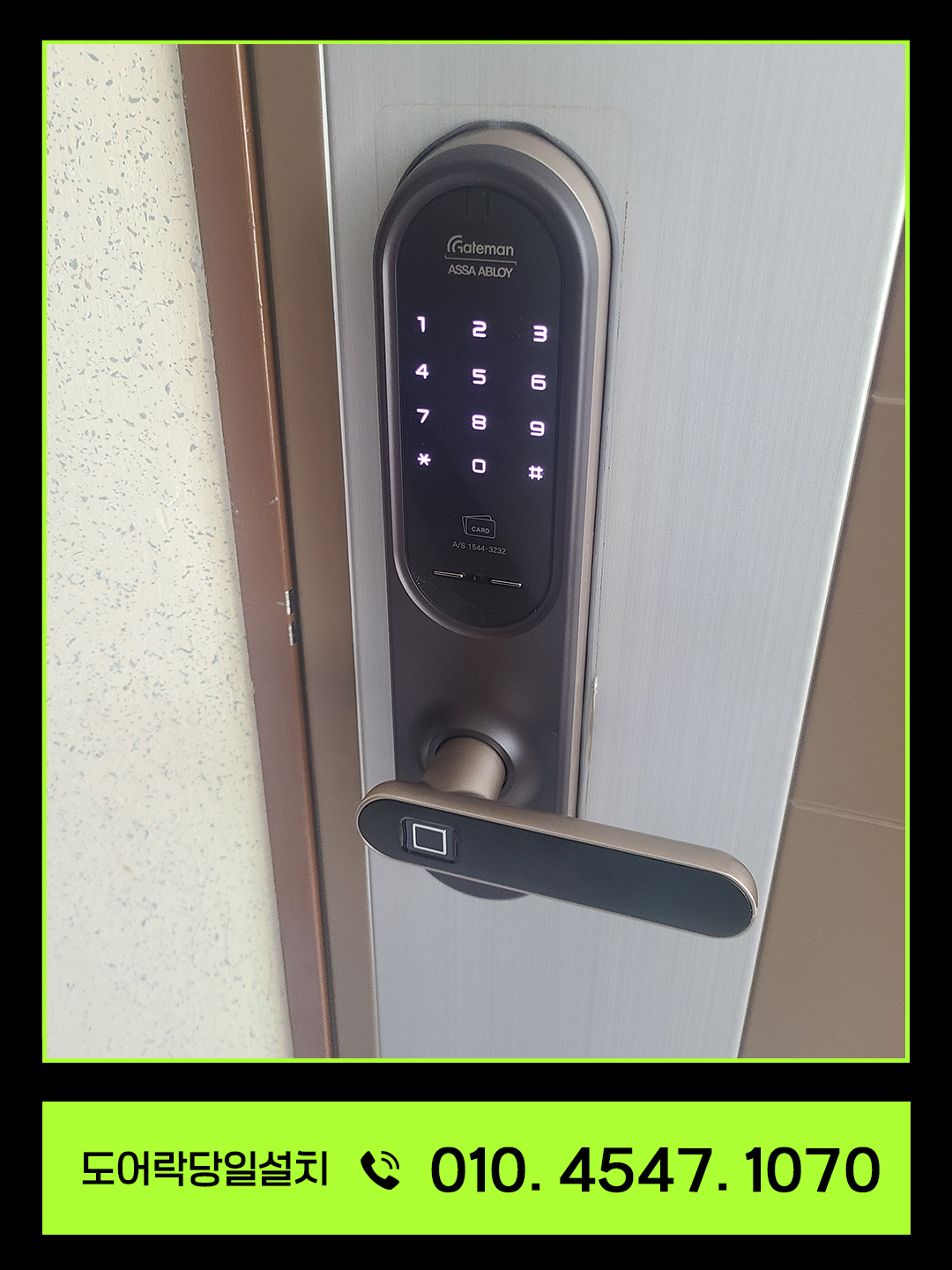 설치 후 고객님께서 말씀하시길, “지문 하나로 문이 열리니까 외출할 때 손에 짐이 많아도 편하다”며 만족해하셨습니다.