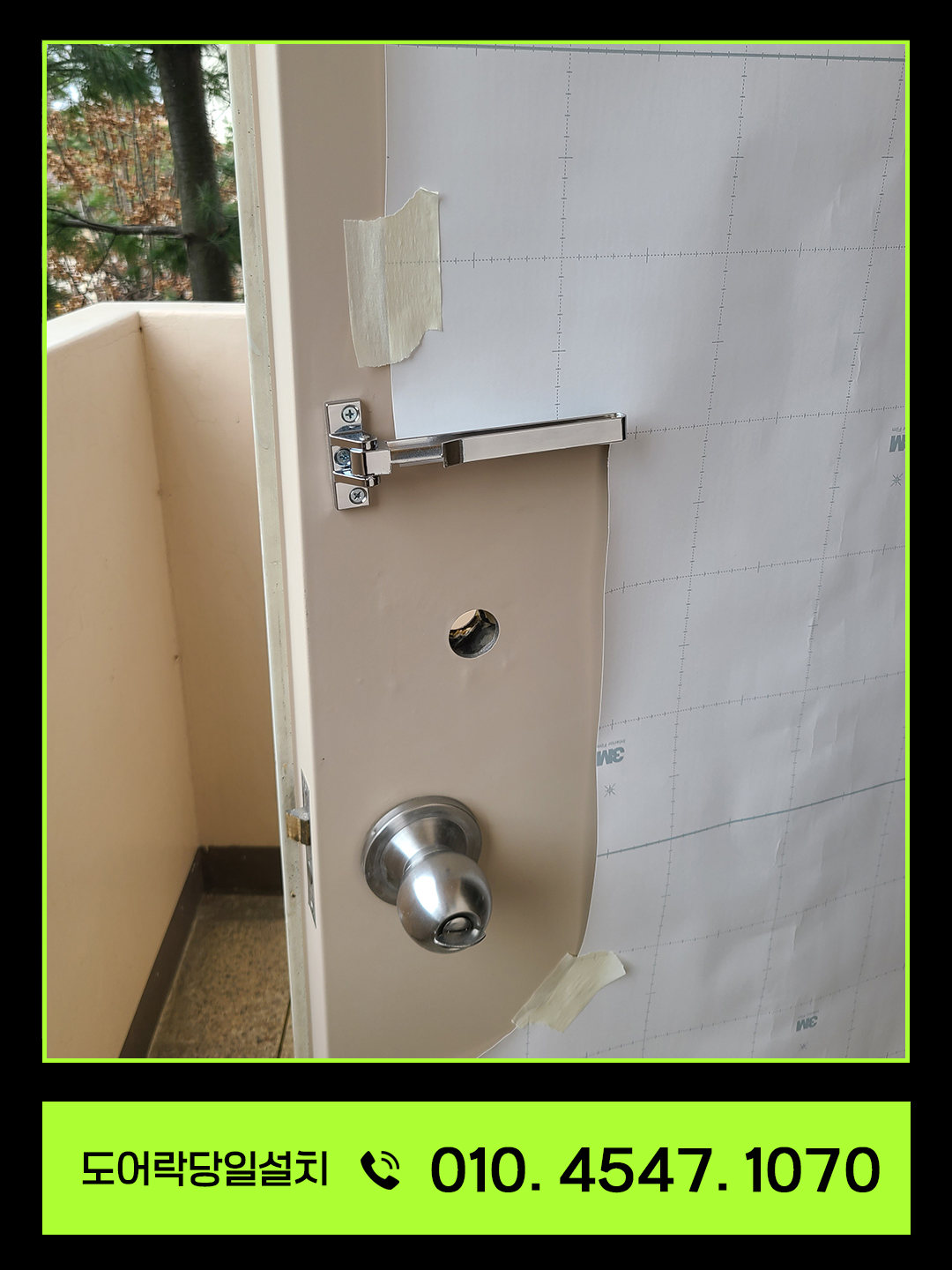 설치 후 문이 부드럽게 닫히도록 도어 클로저와의 간섭 조정도 함께 마무리했습니다.